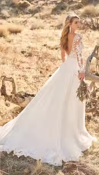 A long sleeve wedding dress brings something truly special to your bridal look. The sleeves add a touch of elegance, a little extra coverage, and a timeless feel that brides love. Some styles are sleek and modern with simple crepe sleeves. Others are soft and romantic with lace that trails down the arms. No matter the fabric or design, long sleeves create a look that feels polished and unforgettable.